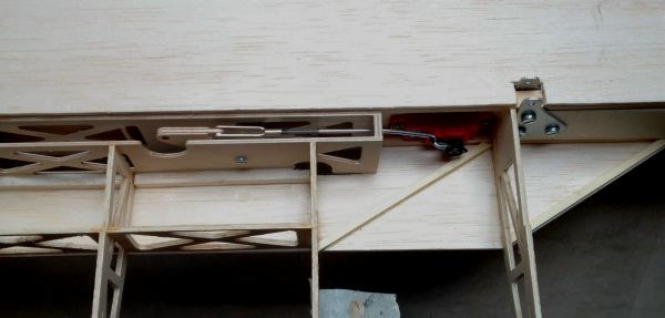 Die Achsen sitzen jetzt akzeptabel gerade im Kasten und die Torsionskräfte der hinteren Rippen werden hier über Kieferngurte unter der Beplankung auf den Hauptholm abgegeben. Das scheint alles vernünftig stabil zu sein. Nach zig fachen Probeläufen habe ich dann mit einem etwas mulmigen Gefühl das Servo an den Kabelbaum gelötet und alles verkastet - wenn da mal was ausfällt wird's lustig . . .