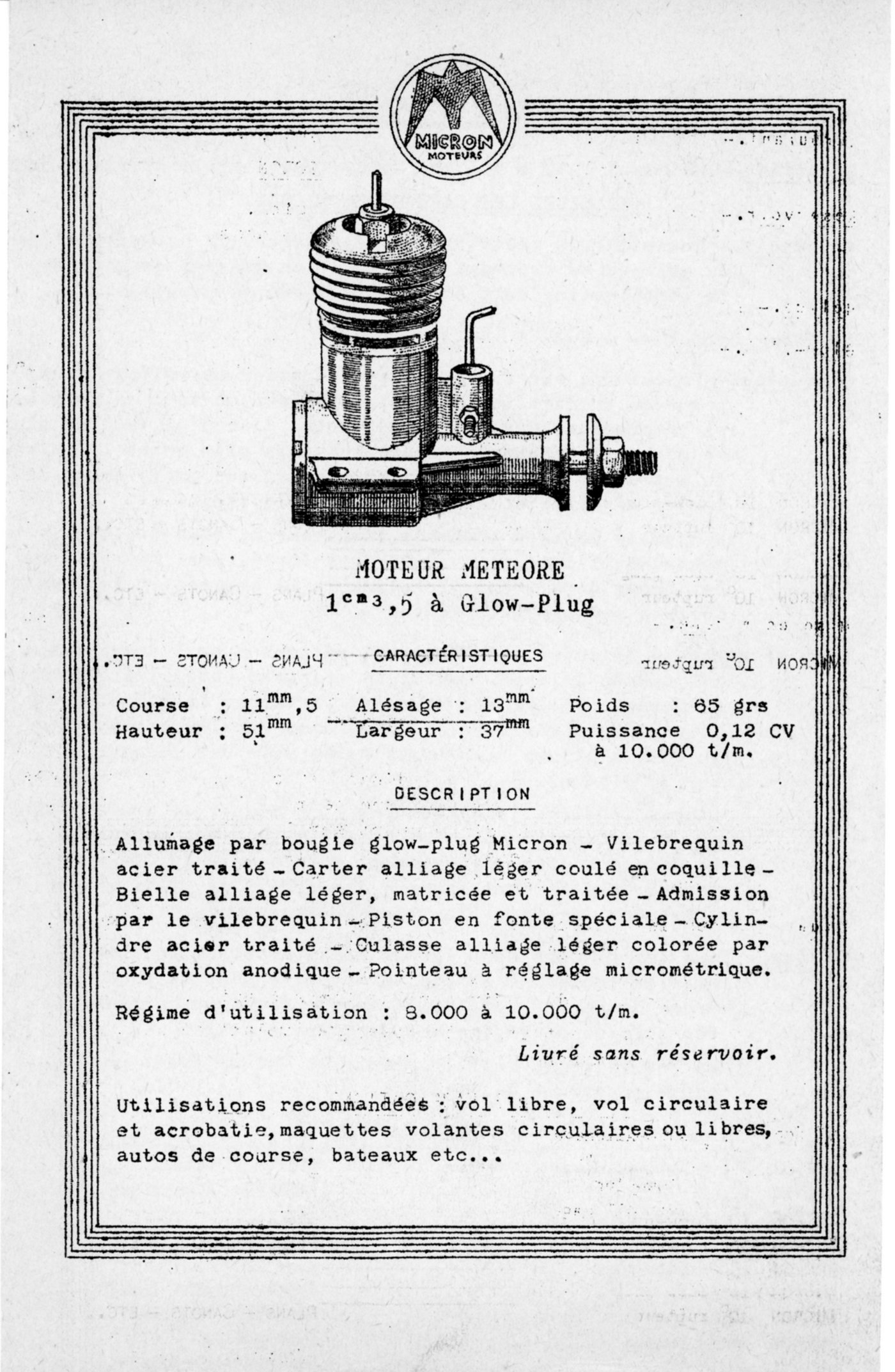 En ce mois de juillet 1943 une certaine perspicacité était nécessaire aux lecteurs du M.R.A pour découvrir que des moteurs beaucoup plus performants car employant une nouvelle technologie étaient disponibles. En effet pas d’article abondamment illustré de nombreuses photos et schémas, Il fallait aller à la dernière page de la revue et s’intéresser à une annonce de petite dimension (5 cm x 8 cm) sans illustration qui était le fait d’une société totalement inconnue: MICRON. Cette annonce, la première de l’entreprise fondée en 1942 par André GLADIEUX, jeune modéliste parisien, marque son réel démarrage. En effet le 2,6 cc à allumage électrique, premier moteur à être produit en série (page 32) au début de 1942 n’a pas porté le nom de MICRON avant de devenir l’AIRPLAN 2,6 cc. Il en est de même pour les autres moteurs réalisés cette année-là comme le 10 cc à allumage électrique. Maurice BAYET le fondateur du M.R.A et modéliste de longue date mesure l’importance de l’événement. Dès le numéro du mois suivant il fait paraître une interview d’André GLADIEUX qu’il a réalisé. Cela va beaucoup aider notre jeune constructeur aux moyens limités. Il ne va pouvoir modifier la publicité qui paraît mensuellement qu’au mois de février 1944 et c’est seulement à ce moment qu’elle intègre une photo. C’est à la suite de présentations sur les terrains du DYNO suisse à auto-allumage qu’André GLADIEUX, séduit par les performances du moteur, décida de se lancer dans l’étude à la fin de l'été 1942 d’un moteur employant cette nouvelle technologie. Conseillé par Maurice DELBREL qui est le premier français à avoir réalisé un moteur à auto-allumage et après de nombreux essais , il va au final mettre au point deux moteurs, un de 5 cc de cylindrée et un de 10 cc en utilisant des carters qu’il avait fait réaliser en petite série par le passé. La commercialisation démarre au mois de juillet 1943. Disposant comme je l’ai dit un peu plus haut de peu de moyen mais aussi du fait de la situation du moment, la production démarre au compte-goutte et les moteurs ne sont disponibles qu’en vente directe. Si le 10cc ne séduit pas, il en va tout autrement du 5 cc qui va rencontrer un succès croissant. Il faut dire qu’il remplace efficacement les moteurs de 7 cc et 10 cc de cylindrée à allumage électrique en offrant des performances supérieures et en permettant en plus de se passer des pesants accessoires nécessaires pour alimenter les bougies à étincelles. L’absence de ces équipements supprimant en plus de nombreuses causes de pannes. Devant ce succès d’autres constructeurs vont se lancer dans le développement de moteurs à auto-allumages. Le premier d’entre eux c’est Prosper ALLOUCHERY avec son 1,25 cc à la fin de 1944. J’ai présenté le MICRON 5cc page 34 et l’ALLOUCHERY 1,25cc à la page 37 .