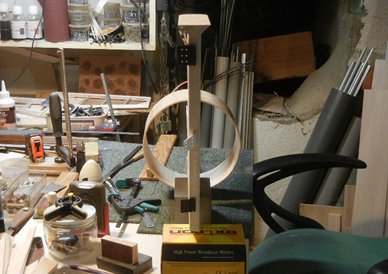 La suite avec le début de la tuyère d'hélice ; j'ai confectionné un gabarit en ®Depron au diamètre de 180mm pour mouler 1 à 2 couches de balsa de 1,5 qui sera ensuite recouvert de papier kraft collé à la blanche diluée ; le but est de faire cette pièce la + légère possible… mais assez résistante.