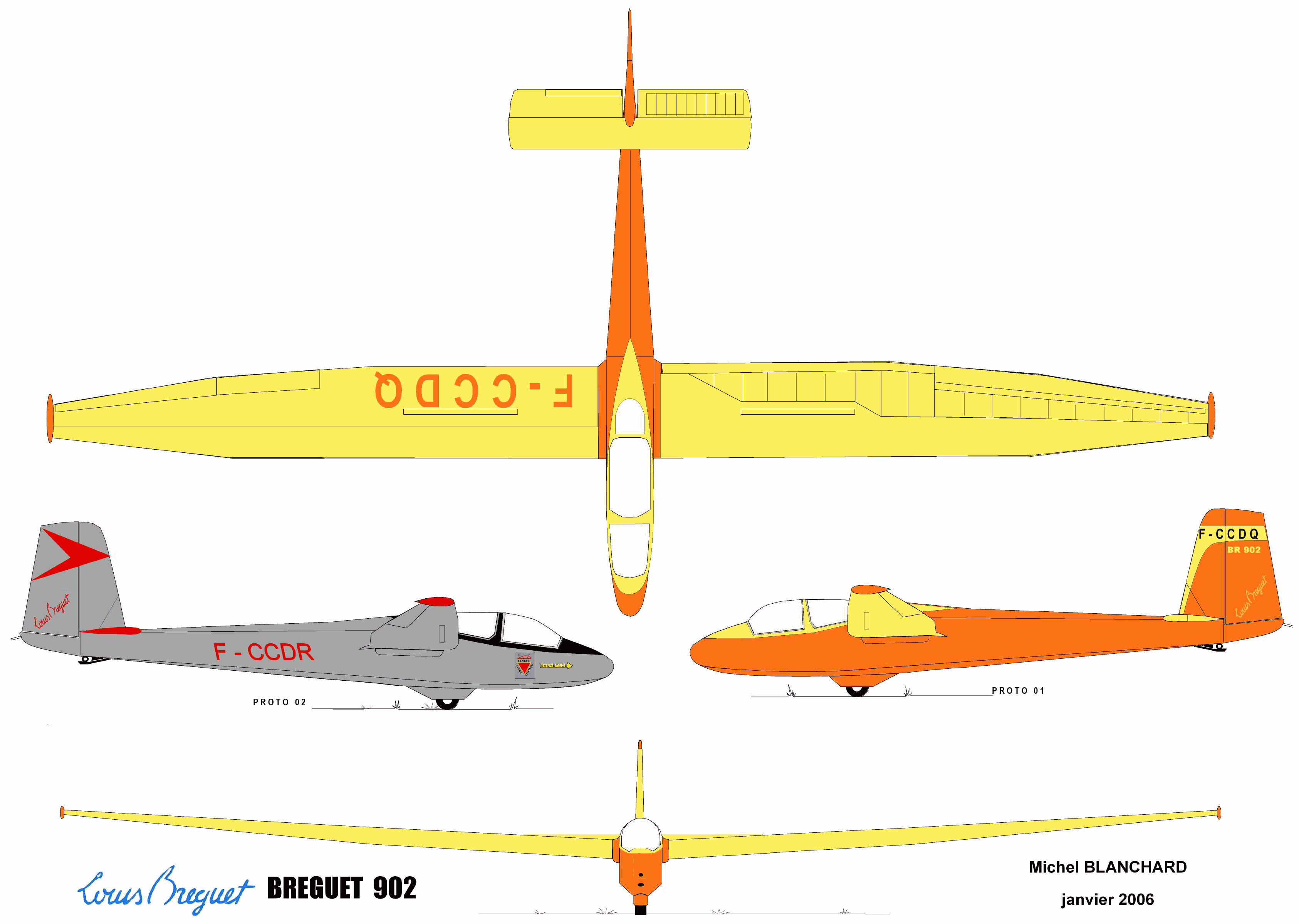 Je suis nouveau sur le forum, mais je souhaite rebondir par rapport aux sujets qui me passionnent et j'ai été surpris de trouver quelqu'un aussi qui cherchait de la doc sur le Bréguet 902. J'ai effectivement depuis longtemps souhaité réaliser la petite maquette du MRA de Janvier 1995 (10 ans ça ne nous rajeunit pas) mais j'ai remis le projet faute de temps (moule de verrière à réaliser et capotage) et aussi par manque de doc (photos noir et blanc du proto F-CCDQ qui n'existe plus) pas de photo du tableau de bord et des détails. L'auteur du plan parle du F-CCDR qui a volé jusque dans les années 90 et dont le modèle reprend la déco mais il n'indique malheureusement ses sources (Avation et Pilote Privé, mais quel numéro?). Je n'ai pas encore cherché vraiment du côté des bouquinistes, ni du centre de documentation du musée de l'air qui n'est ouvert qu'en semaine. Je sais qu'il y avait dans le temps un docavia qui traitait des planeurs Bréguet avec les avions Bréguet évidemment majoritaires(le projet Bréguet 907 avait été extrapolé par des modélistes il y a une vingtaine d'année à partir de cette source si mes souvenirs sont exacts).