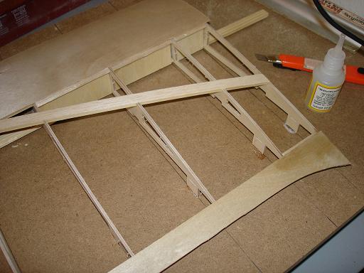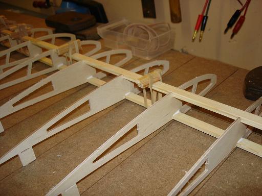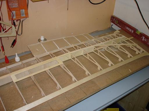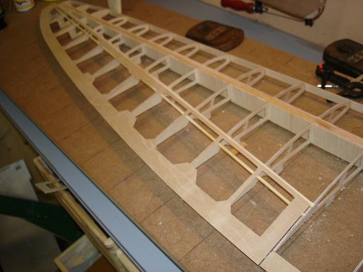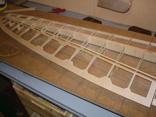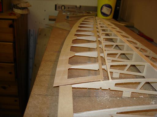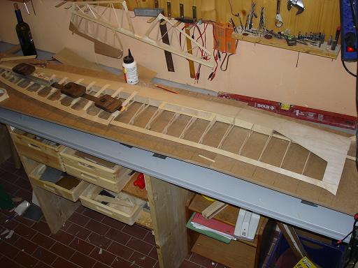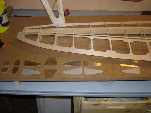 Ich denke das ist kein großes Problem - wenn es ganz schlimm ist werde ich die Zwischenräume mit Balsa auffüttern und dann die Unterseite aufziehen. Nebenbei stört es mich nicht besonders wenn die Endleiste ein wenig wellig ist - das war bei den Orginalen nicht anders und ich möchte ja auch den Charakter des Orginals darstellen - und da gab es eben viele Unebenheiten...