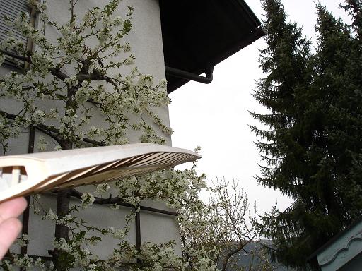 Die Rechte... die linke Fläche wurde vom Baubrett getrennt und alle Überstände der Füßchen grob geschliffen. Für Lothar und nach dem Vorbild von "Le Chef" folgende Bilder (wir haben leider keinen so schönen blauen Himmel wie Vincent deshalb mein Weichselbaum in Vollblüte als Hintergrund...)