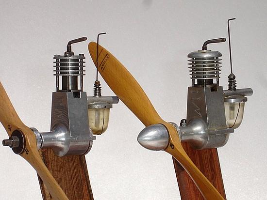 Pour le plaisir, le Brown (0,26 CV à 6200 t/mn, hélice 14x6 - Peter Chinn Aeromodeller Sept. 1983) à coté d'un Picco 10 cm3 de vitesse de 1992 (environ 4 CV à 24000 t/mn, hélice 8x12)
